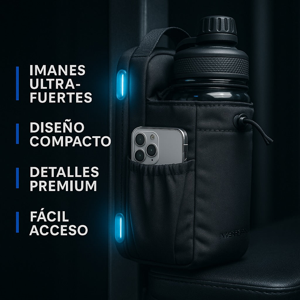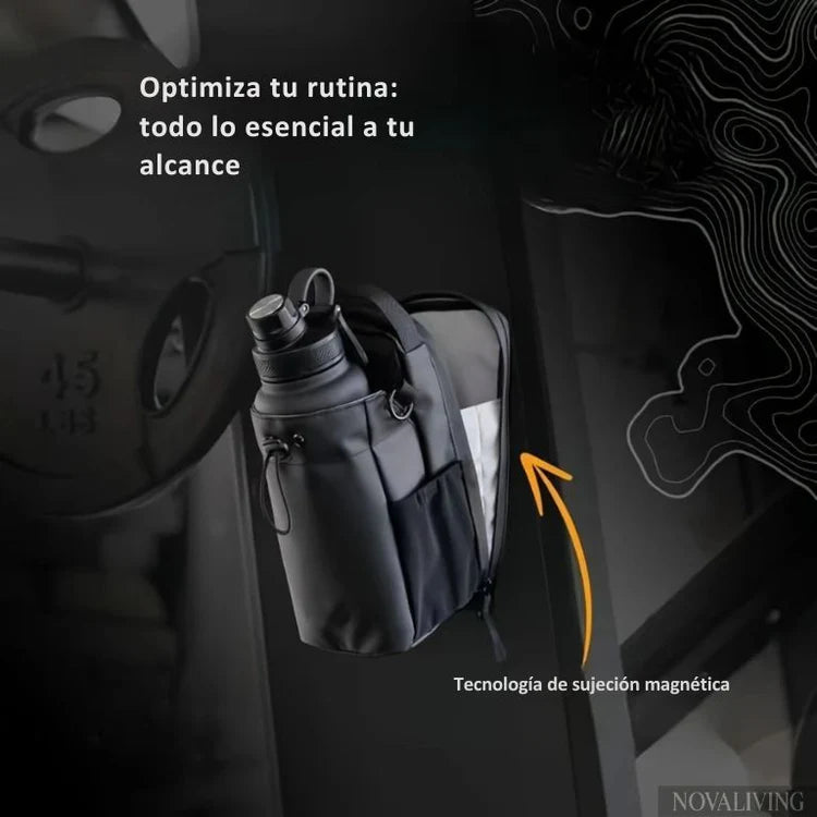 Gym Bag Magnético Pro: Bolso impermeable con compartimento para termo, bolsillos laterales, fijación magnética y correa ajustable.